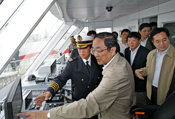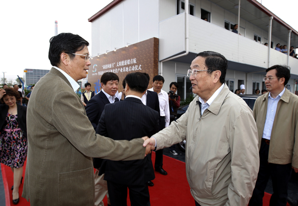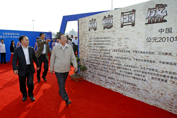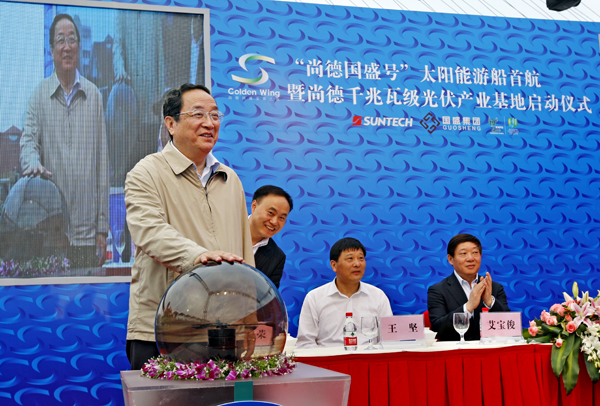 近日,我国第一艘太阳能混合动力游船“尚德国盛号”在上海黄浦江畔起航。中共中央政治局委员、市委书记俞正声出席仪式并为“尚德国盛号”游轮首航启动“能量球”。市委常委、市委秘书长丁薛祥,副市长艾宝俊,市经信委主任王坚、副主任尚玉英,市国资委副主任刘燮,尚德公司总裁施正荣,国盛集团董事长施德容等出席了仪式。